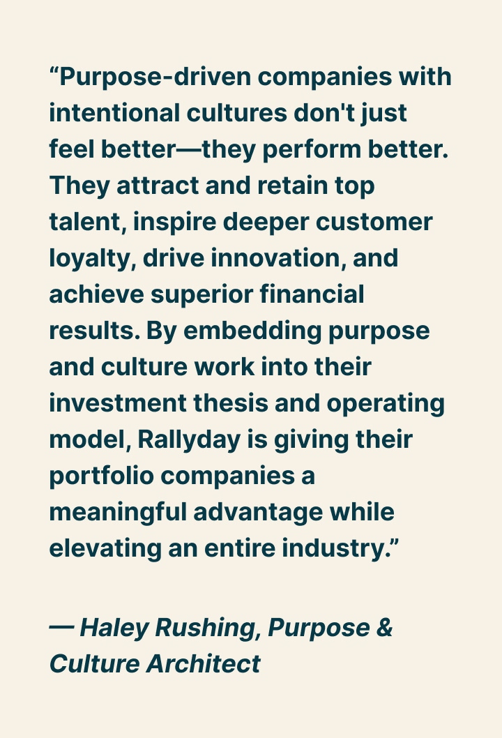 “What makes this partnership so exciting is that Rallyday understands what research consistently shows: purpose-driven companies with intentional cultures don’t just feel better—they perform better. They attract and retain top talent, inspire deeper customer loyalty, drive innovation, and achieve superior financial results. By embedding purpose and culture work into their investment thesis and operating model, Rallyday is giving their portfolio companies a meaningful advantage while elevating an entire industry.”